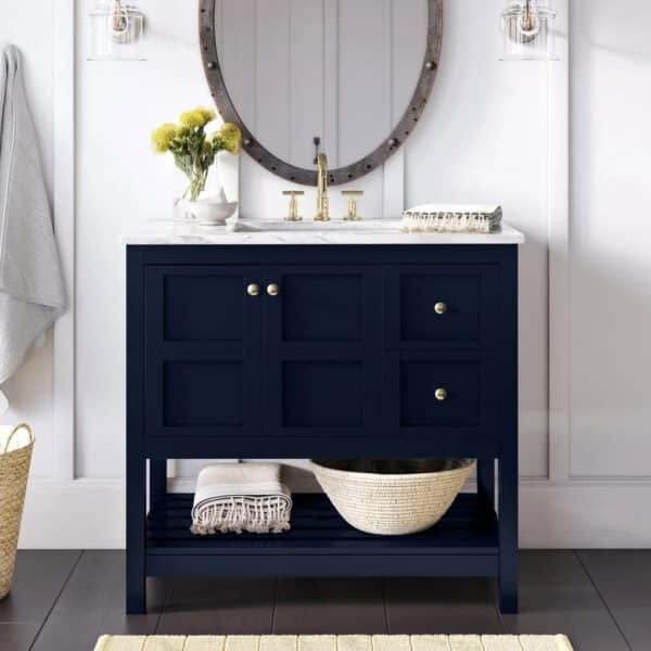 Navy bathroom vanity with a calacatta white engineered marble top.