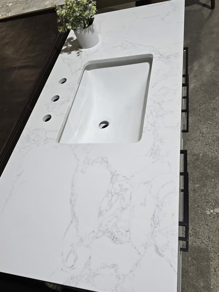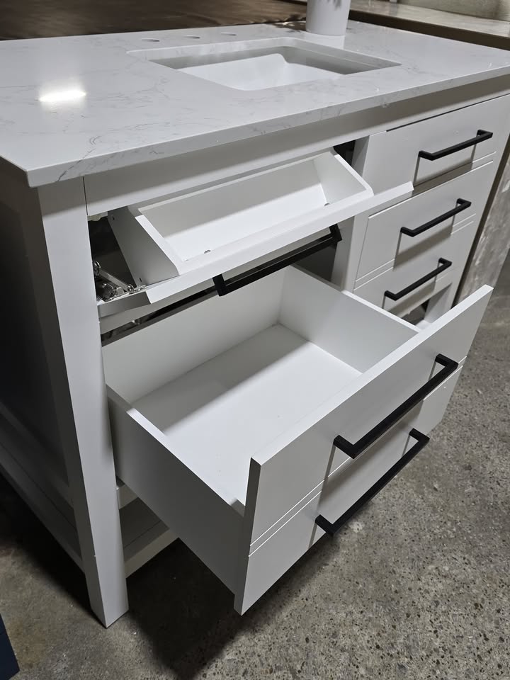 White with an engineered marble countertop. Matte black handles.