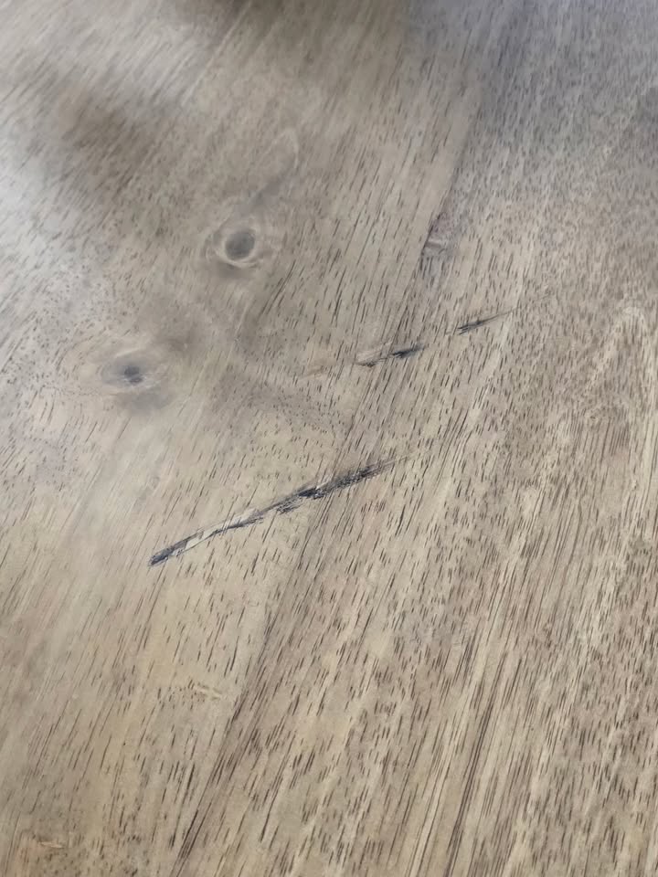 Thick solid parawood with a honey oak finish. Came with some scuffs on the edges and one on top. (see photos)