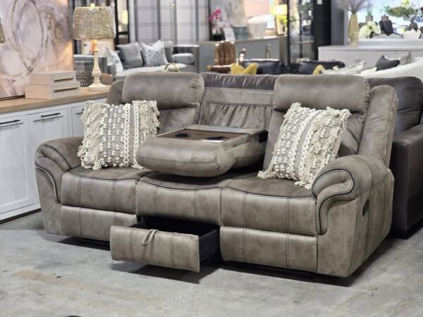 NEW! Nice manual reclining sofa with a drop down table. Table features two cup holders and USB ports and outlets.