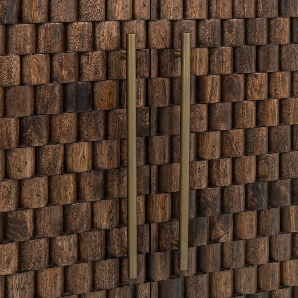 Has beautiful hand carved -textured doors with oversized gold handles.
