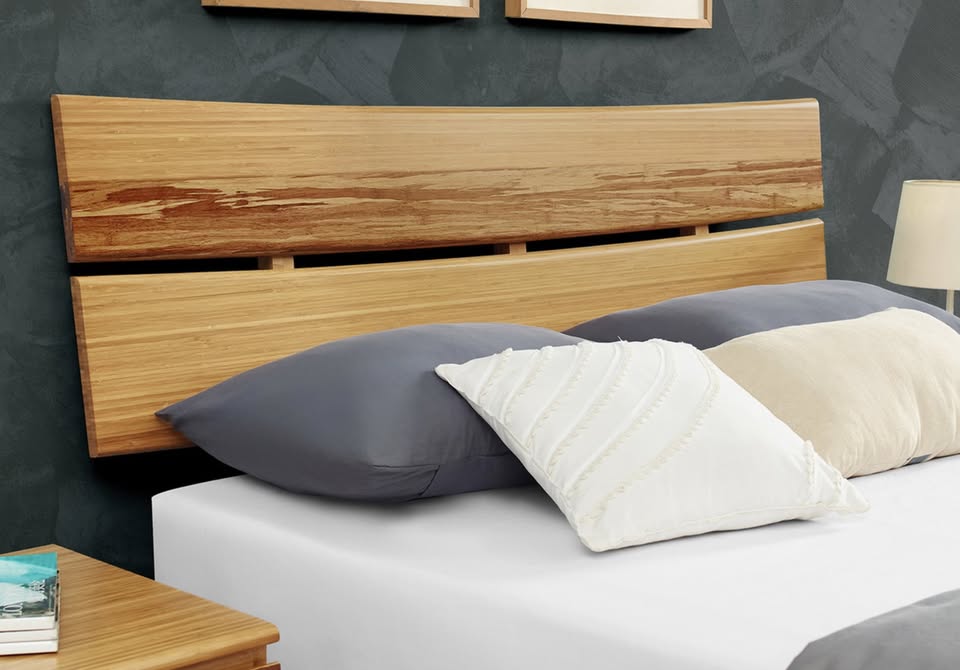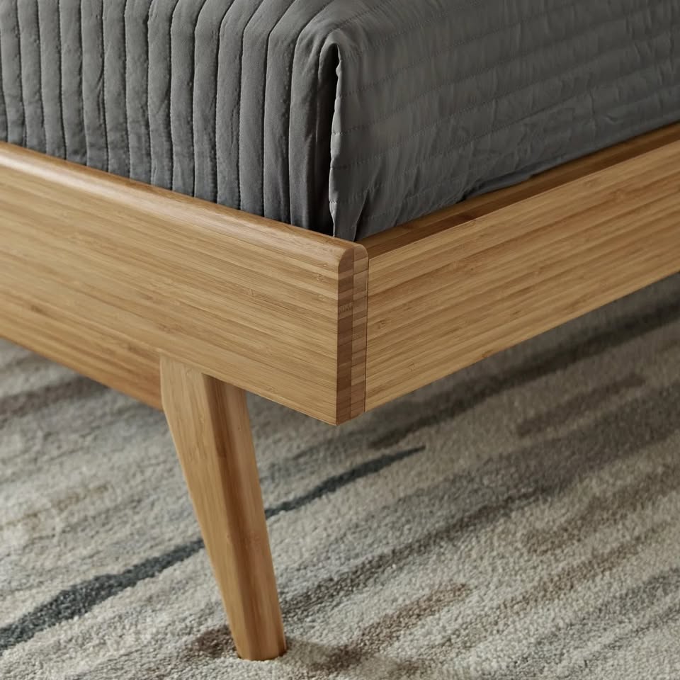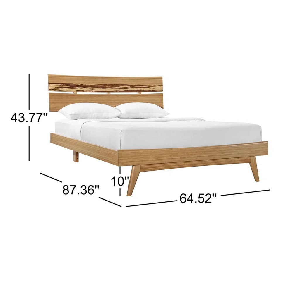 It's made of solid tiger bamboo in a mid-century modern silhouette. This bed frame features a headboard made of two slightly curved wood panels with natural wood grain variation for a rustic touch. A clean-lined frame and tapered legs add to the vintage-inspired look.