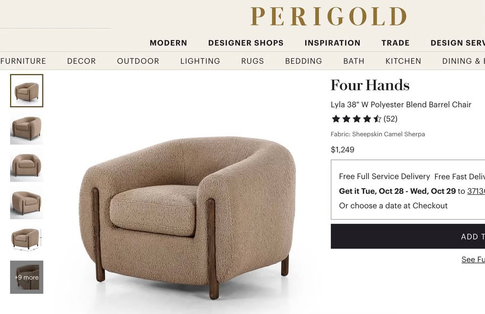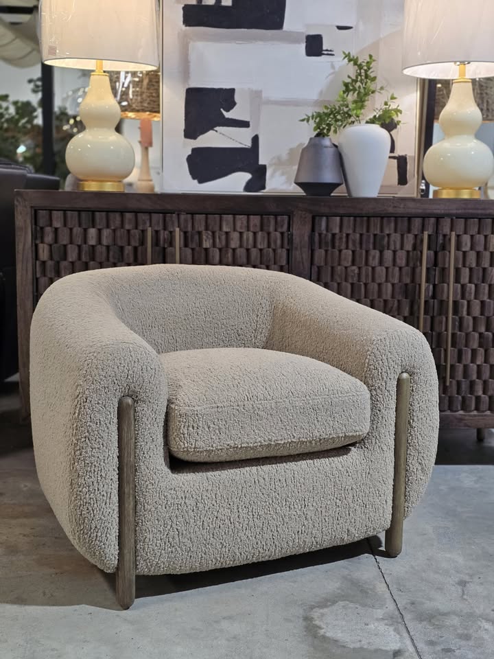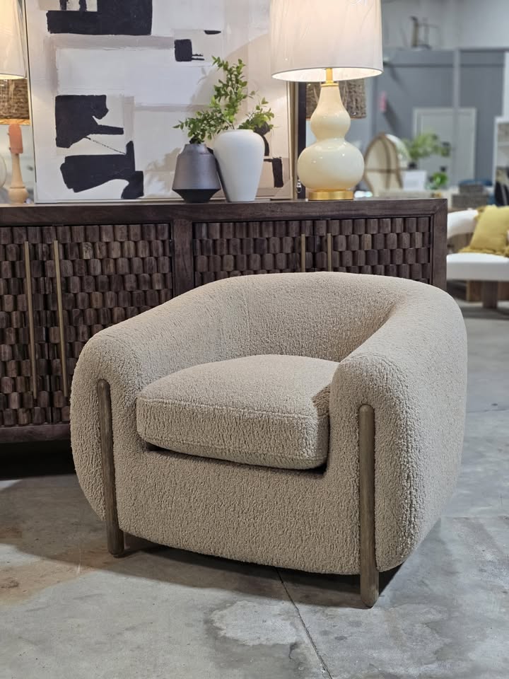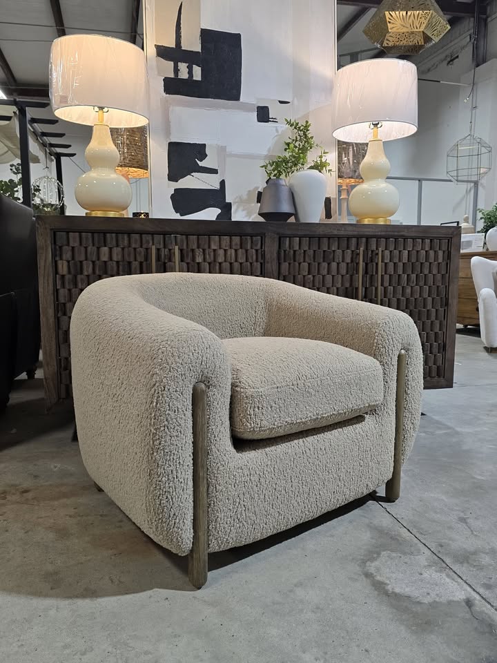 A fresh take on the traditional tub chair, with exaggerated depth for drama and comfort. Solid wood legs intersect sheepskin upholstery for clean contrast and scale.