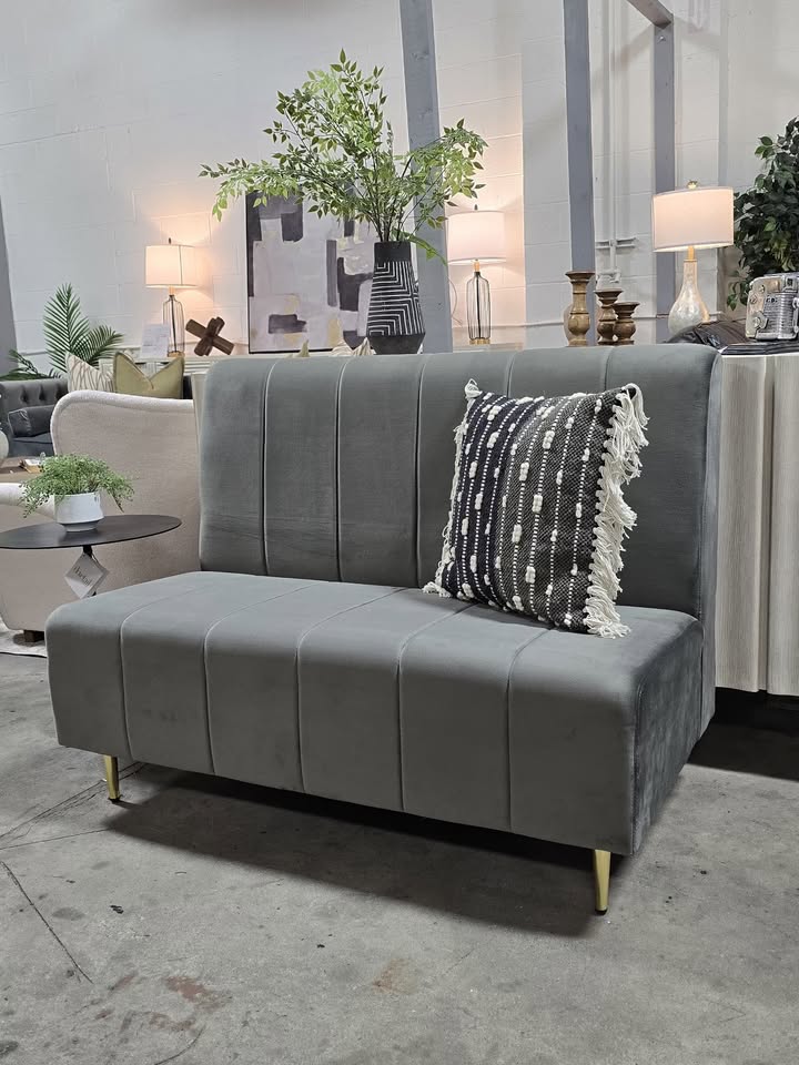 Grey velvet material with gold legs.