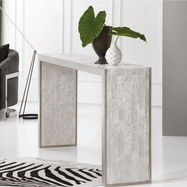 Crafted of faux golf leaf on metal with a Selenite top, the slim table has a serene white, cream, and beige color palette.