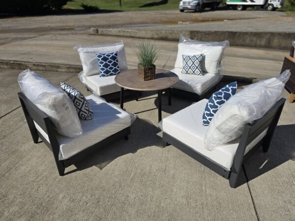 Built with a rust-free aluminum frame in grey. Sink into luxury with our high-performance Olefin fabric cushions that are engineered to withstand outdoor use while maintaining their plush comfort. Seat cushions are 7" thick.
