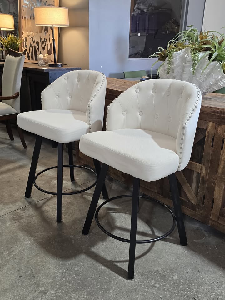 Beige upholstered swivel stools on a black metal frame. Price is for both.