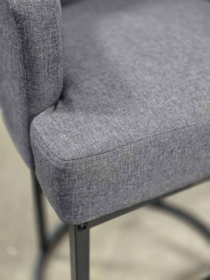 Charcoal upholstery with black metal base.
