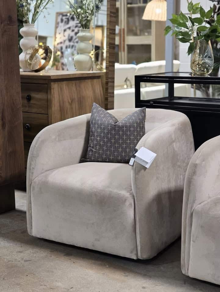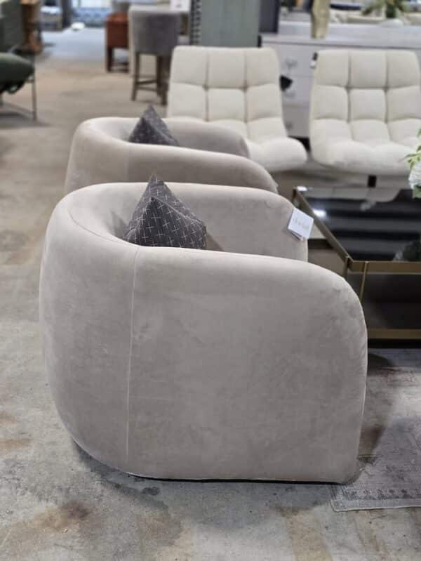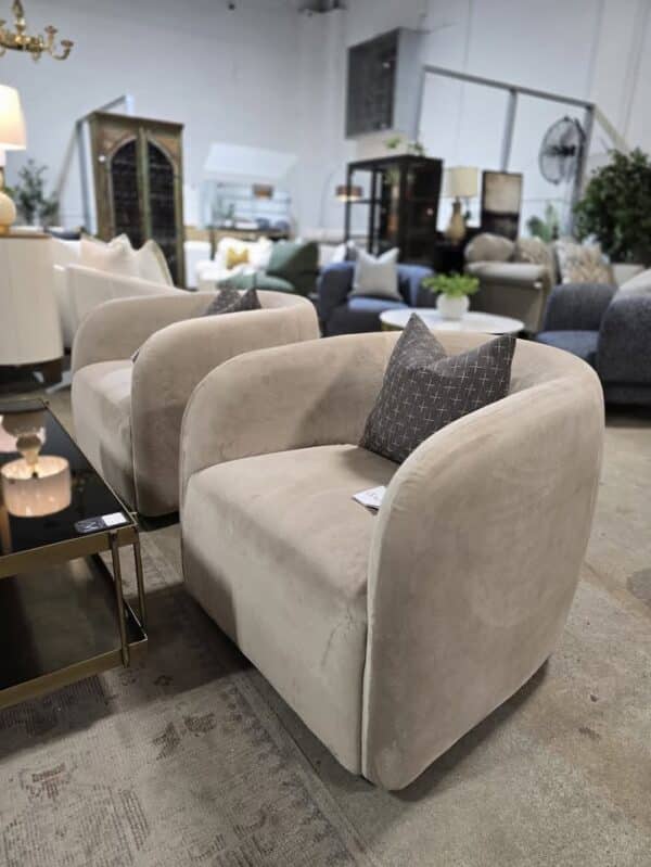 Taupe velvet upholstery.