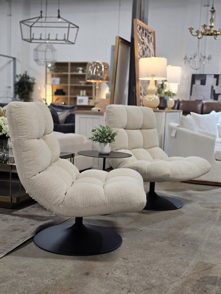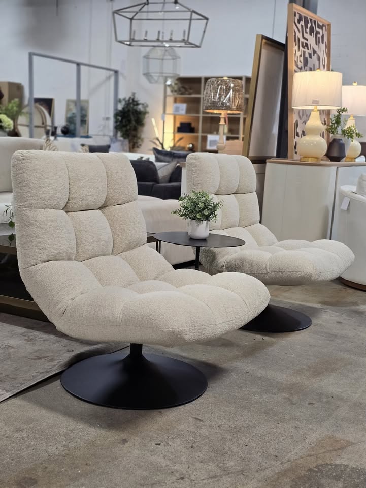 Cream boucle material with a black metal base.