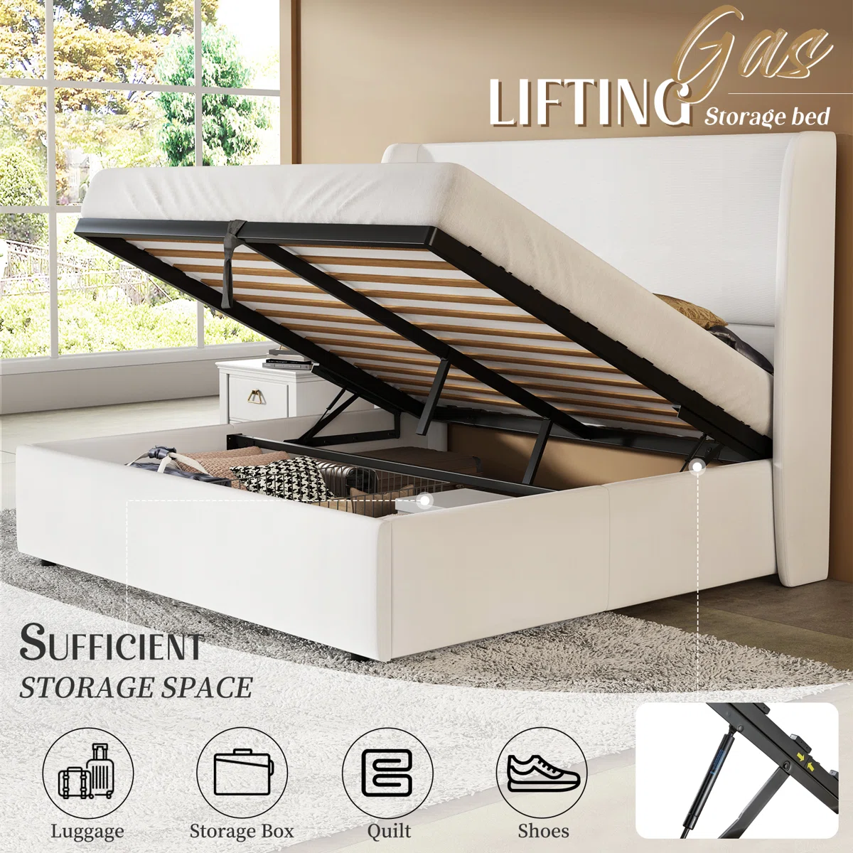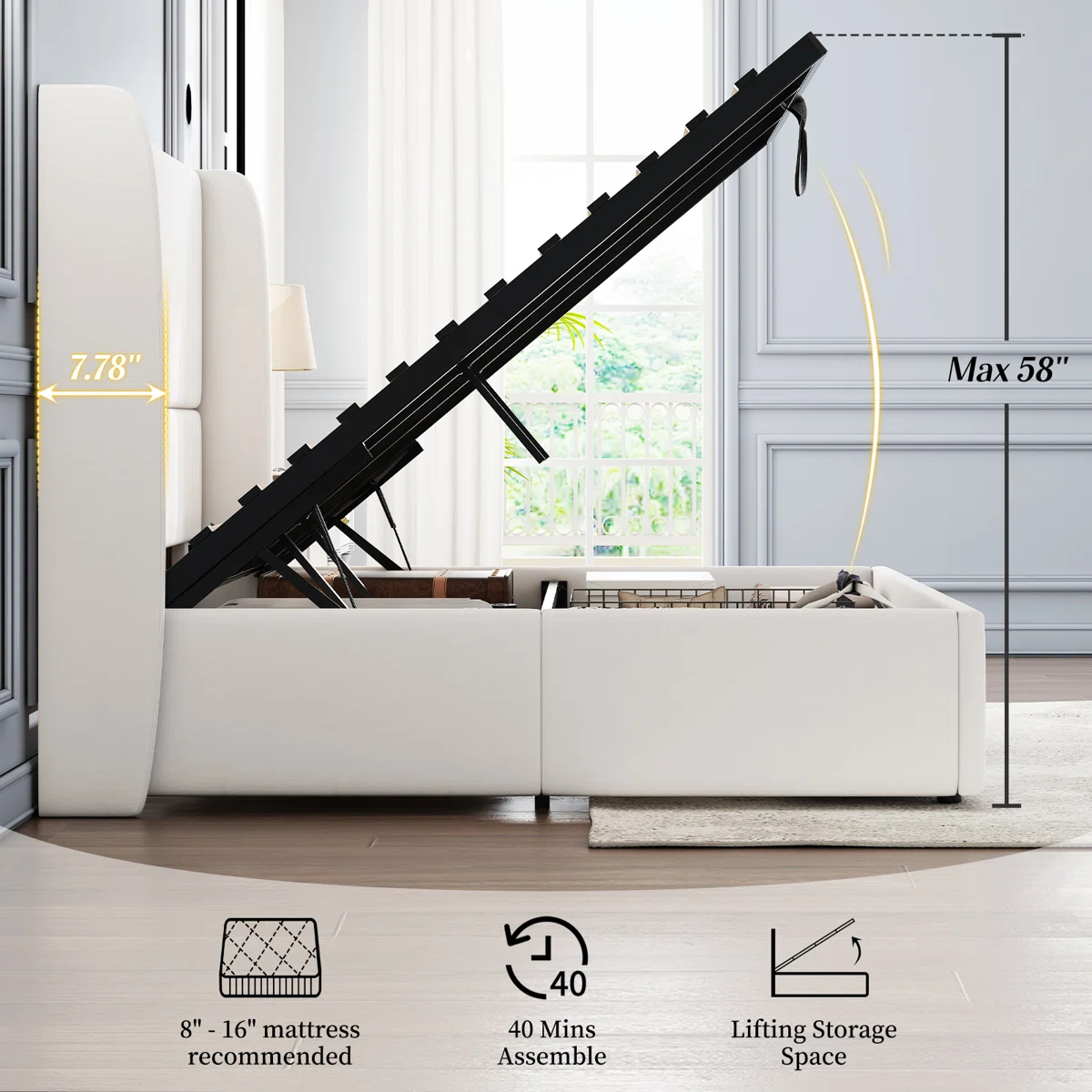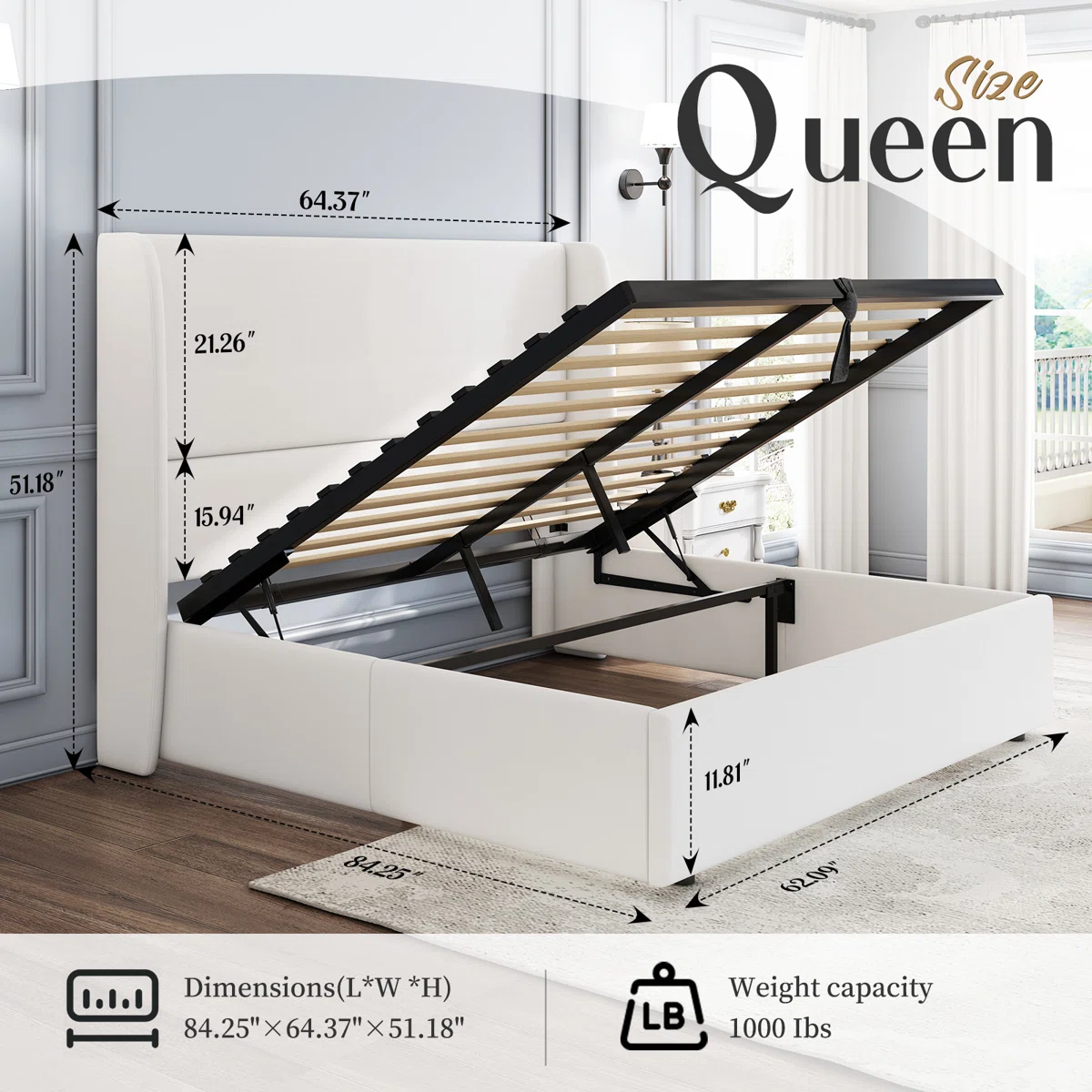 BRAND NEW IN BOX! Queen size. Has storage underneath. White linen upholstery. 51.2'' H X 64.37'' W X 84.3'' L